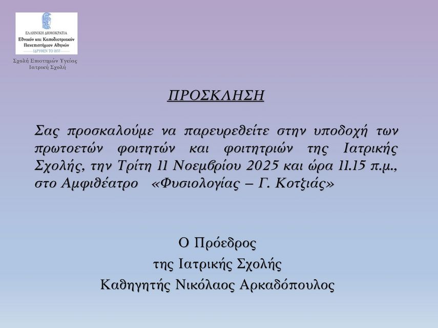 ΠΡΟΣΚΛΗΣΗ ΥΠΟΔΟΧΗΣ ΠΡΩΤΟΕΤΩΝ ΦΟΙΤΗΤΩΝ ΤΡΙΤΗ 11.11.2025